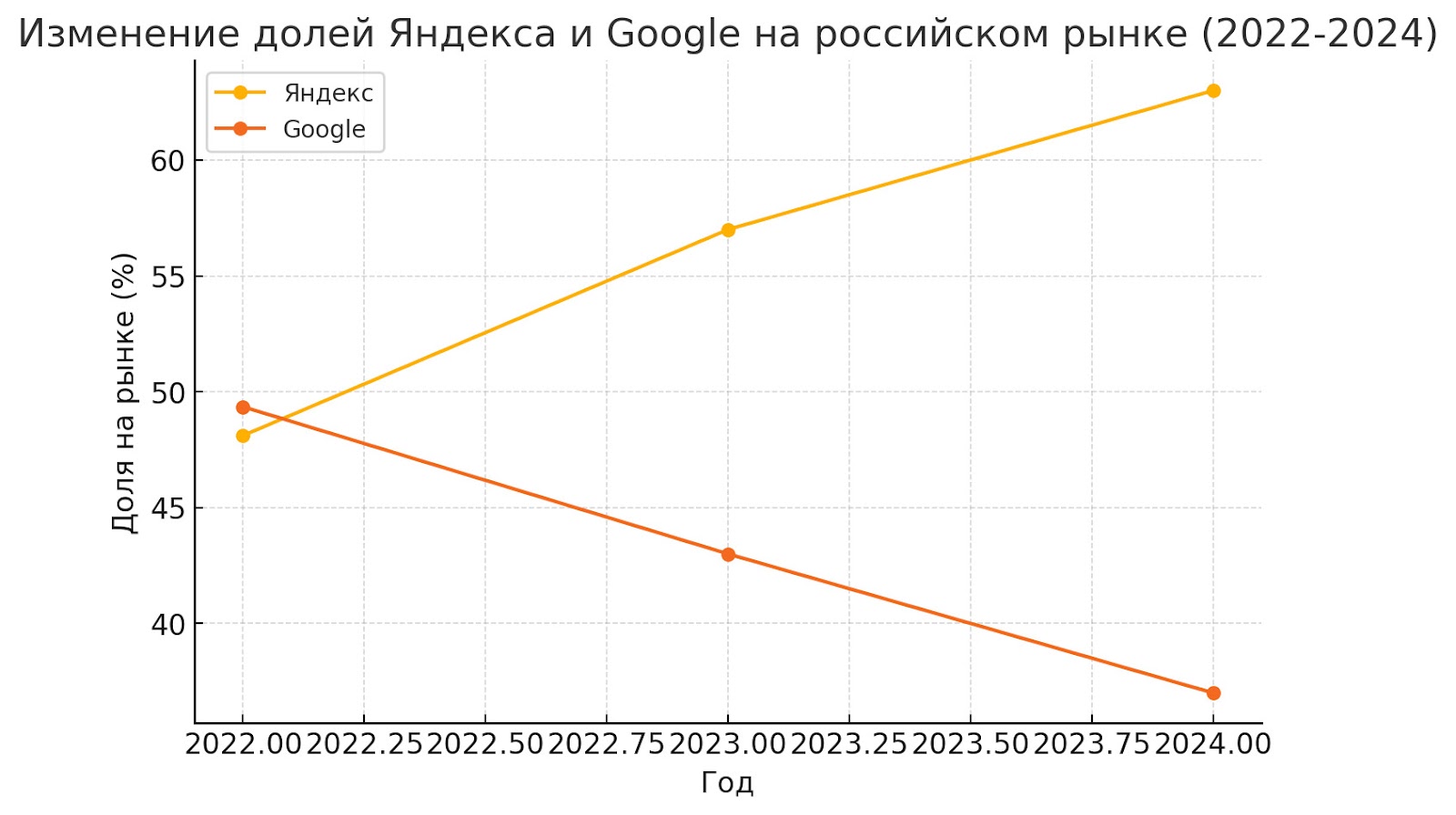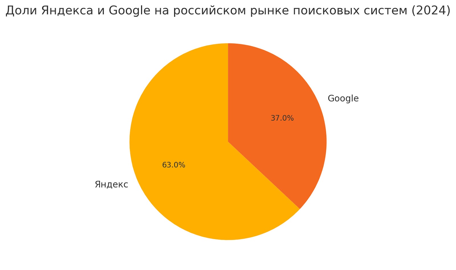 В 2024 году Яндекс значительно укрепил свои позиции на российском рынке, увеличив свою долю до 63,8%, в то время как доля Google снизилась до 36,95%. Рост доли Яндекса в Рунете связан с увеличением пользовательского трафика и внедрением новых рекламных решений, что открывает перед рекламодателями дополнительные возможности.