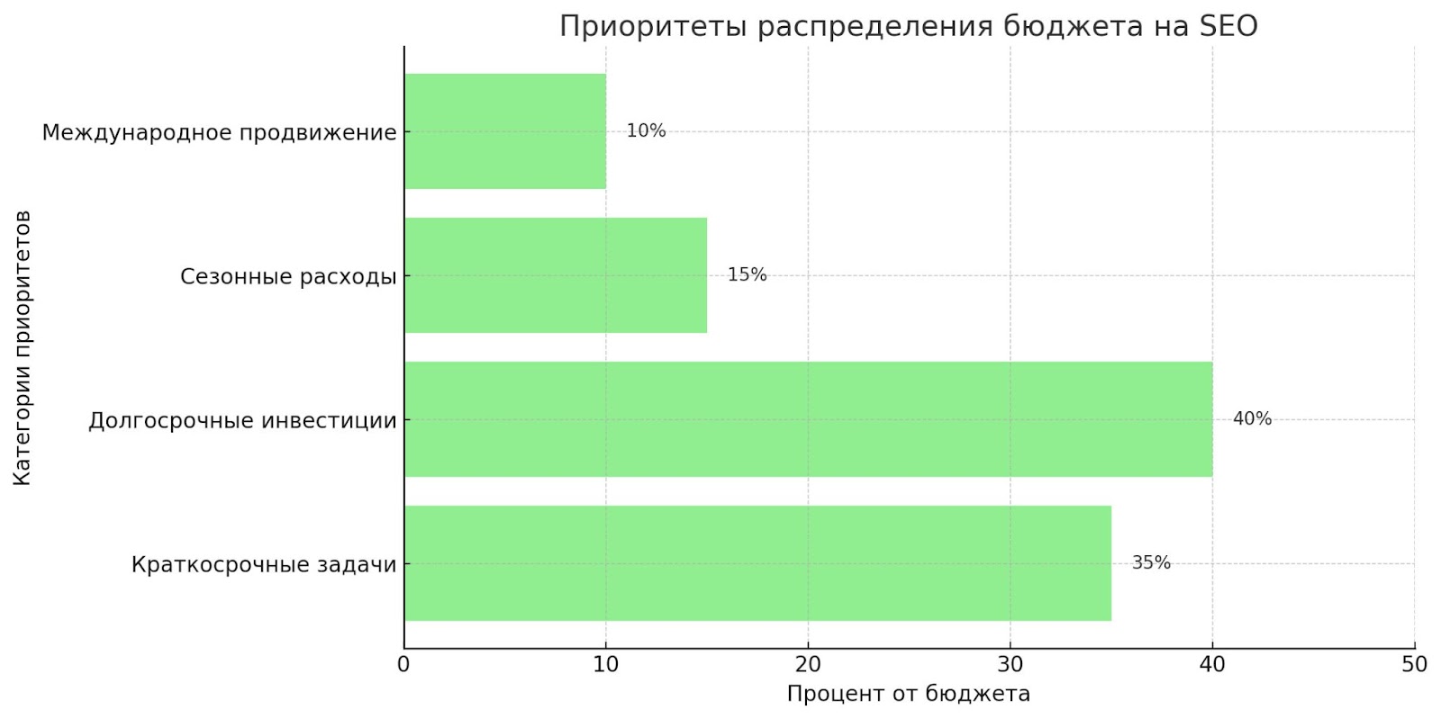 Доход. Рекомендуется выделять на SEO-продвижение от 5% до 10% общего дохода компании. Важно учитывать расходы на другие каналы продвижения для создания гармоничной маркетинговой стратегии.